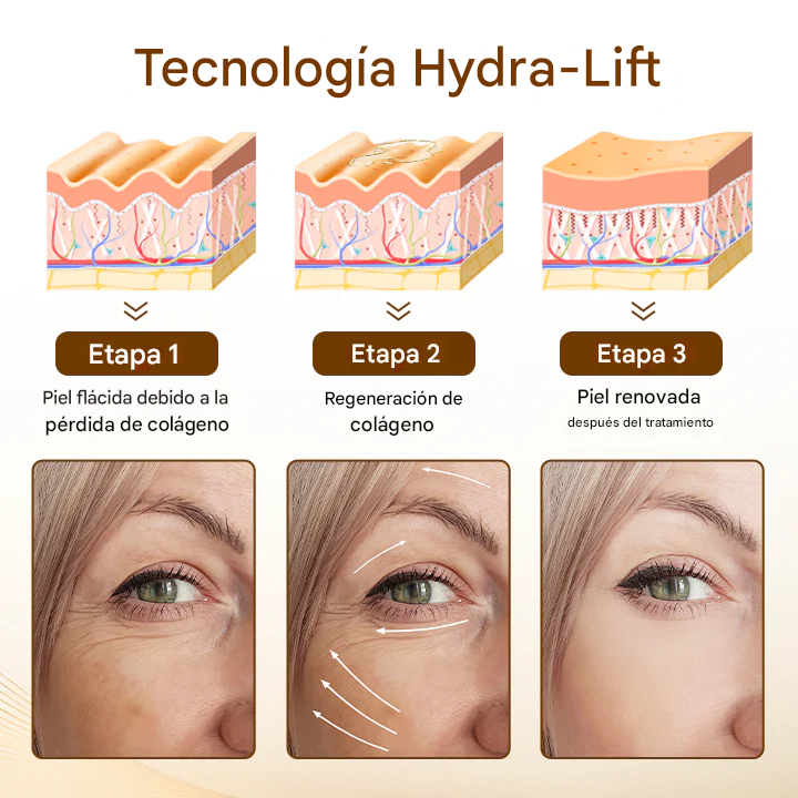 Su avanzada tecnología Hydra-Lift rellena instantáneamente las líneas finas, reafirma los contornos y reaviva la elasticidad juvenil, brindándote confianza en cada mirada.