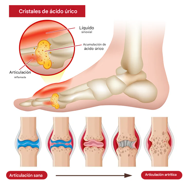 La gota es una artritis metabólica causada por la acumulación de ácido úrico, que produce ataques recurrentes de dolor e hinchazón, a menudo en el dedo gordo del pie, las rodillas o los codos.